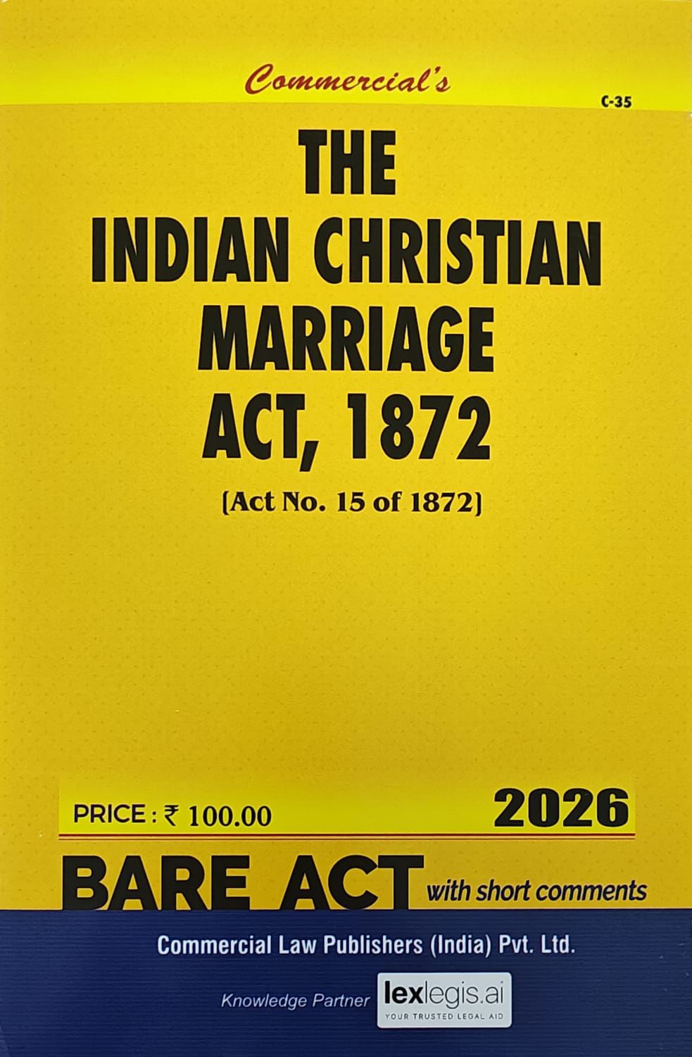 This edition of The Indian Christian Marriage Act, 1872 (Act No. 15 of 1872) offers the complete and authentic text of the statute governing the law relating to solemnization and registration of marriages among Christians in India. Presented in its original, unannotated form, this Bare Act serves as a dependable legal reference for students, AIBE aspirants, academicians, and legal practitioners dealing with personal laws, family law matters, or marriage registration procedures.