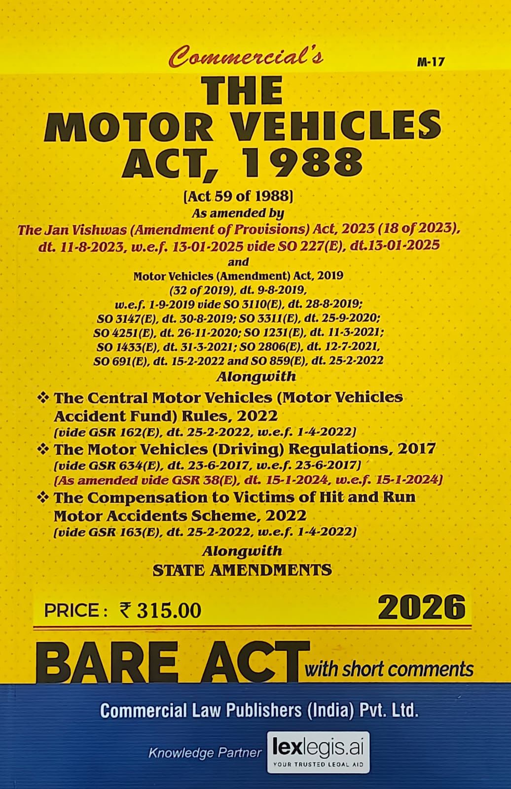 This edition of *The Motor Vehicles Act, 1988* (Act 59 of 1988) presents the updated and authoritative text of India’s principal legislation governing motor vehicles, incorporating all amendments in force up to 2025–26. The Act is comprehensively revised to include the *Jan Vishwas (Amendment of Provisions) Act, 2023*, and subsequent notifications, ensuring complete alignment with the current legal framework. Designed as a dependable statutory reference, this publication reproduces the law as enacted, with short comments, making it especially suitable for examination use and practical legal consultation.