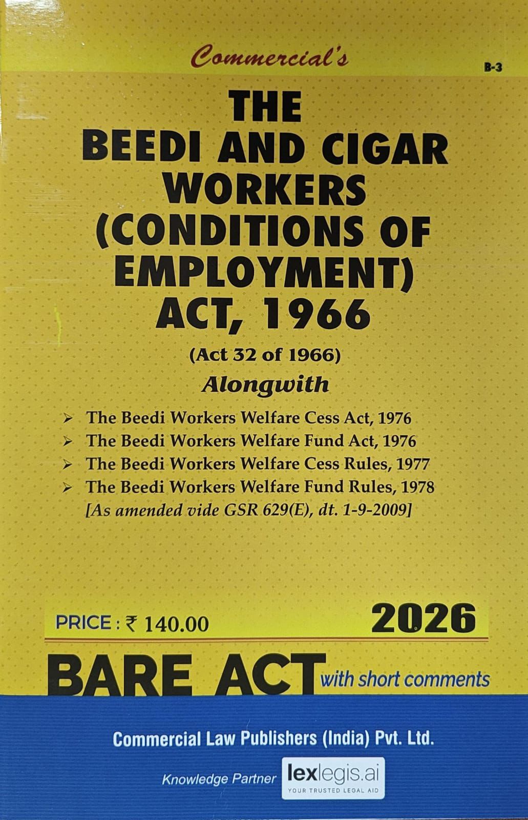 This edition of The Beedi and Cigar Workers (Conditions of Employment) Act, 1966 (Act 32 of 1966), updated up to 2026, serves as a comprehensive legal reference for students, practitioners, and professionals engaged in labor law, industrial relations, and employment regulation. The book presents the bare text of the Act along with the allied legislations and rules governing the welfare and employment of beedi and cigar workers in India, ensuring accuracy and statutory completeness for academic and professional use. It includes the following enactments and subordinate legislation: